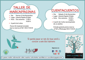 El Sábado 23 de Noviembre "Cuentacuentos Voy a Comedte" con entrada gratuita (previa reserva) para niñ@s a partir de 3 años. Se realizarán dos siisones a las 10:30. y a las 12:00h.