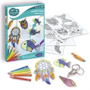 Diviértete dando color a los diseños de estas láminas de film retráctil. A continuación, recórtalos y mételos en el horno a 180º. En solo unos minutos, ¡las hojas reducen siete veces su tamaño original! Esto las hace perfectas para convertirlas en imanes o llaveros gracias a los elementos incluidos en el kit.