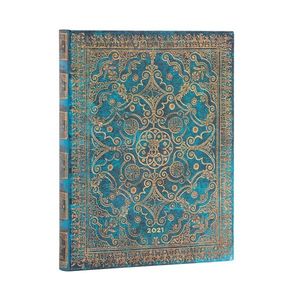 La edición de 1688 de Loffice de la Semaine Sainte, obra litúrgica en latín, estaba protegida por una encuadernación en piel con acabados en oro. Este antiguo diseño, reproducido en nuestra agenda Azur sobre un fondo de color azul intenso, exhibe un elaborado motivo de zarcillos dorados.