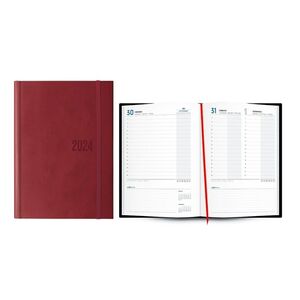 Agenda los angeles d/p 15x21 granate 2024. Papel blanco ecologico 70 gr opaco satinado. Impresión a 2 tintas. Tapa dura polipiel termovirante. Cierre goma elastica. Encuadernada con cinta punto lectura. 6 paginas por semana