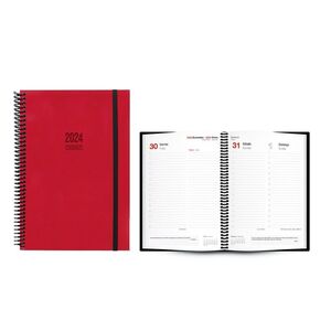Agenda tokio d/p 17x24 rojo 2024. Papel blanco ecologico 80gr opaco satinado. Impresión 2 tintas. Tapa dura polipiel termovirante. Encuadernada en espiral plastico con cierre goma elastica. 6 paginas por semana
