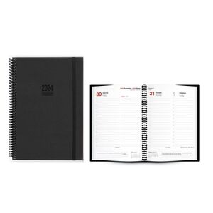 Agenda tokio d/p 17x24 negro 2024. Papel blanco ecologico 80gr opaco satinado. Impresión 2 tintas. Tapa dura polipiel termovirante. Encuadernada en espiral plastico con cierre goma elastica. 6 paginas por semana