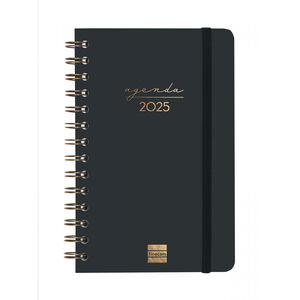 Agenda de espiral de tapa dura de cartón forrado con peliculado mate antirrayaduras y efecto soft touch. Diseño elegante y sofisticado con detalles estampados metalizados. Ideal para uso personal y/o profesional. Con goma elástica y esquinas microperforadas para localizar rápidamente el día/semana en curso. Incorpora un set de adhesivos temáticos. El diseño interior es limpio y fácil, con espacio suficiente para organizar tus proyectos, tareas y compromisos. Contiene información de interés en la anualidad y otros contenidos extra orientados a la organización personal.