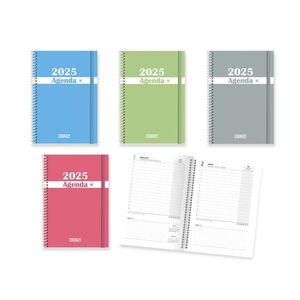 Agenda diseño 2025- lisos d/p. Expositor 12 modelos surtidos.Papel blanco ecologico 80gr opaco satinado. Impresión 2 tintas. Tapa dura forrada papel impreso. Cierre goma elastica. Encuadernada espiral plastico. 6 paginas por semana