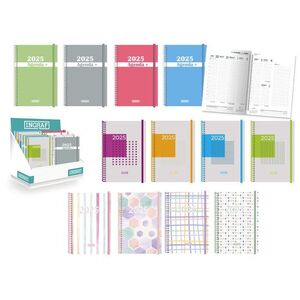 Agenda diseño 2025- s/v. Expositor 24 unidades. Papel blanco ecologico 80gr opaco satinado. Impresión 2 tintas. Tapa dura forrada papel impreso. Cierre goma elastica. Encuadernada espiral plastico . 6 paginas por semana