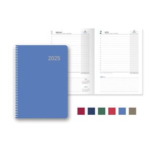 Agenda roma d/p 15x21 surt cas 2025. Exp 12 unidades. Papel blanco ecologico 80gr opaco satinado. Impresión a 2 tintas. Tapa acolchada y forrada en fluxo. Encuadernado con cinta punto lectura. 6 dias por semana espiral plastica