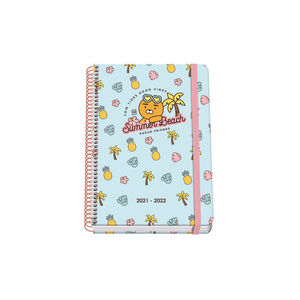 Agenda escolar tamaño A5 con espiral de plástico y cierre de goma elástica. Interior en formato día página con 72 hojas en papel offset impresas a dos colores.