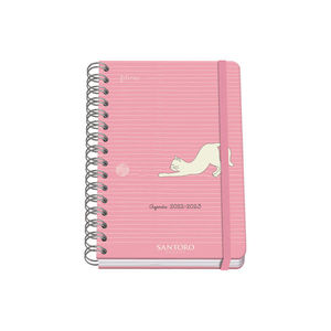 Agenda Semana vista - A5 - S/V - Santoro Felines. - A5 wire?o tapa dura 150 x 210 mm. Cubierta en cartón forrado con papel impreso a todo color y plastificado mate. Guardas impresas. Espiral metálico doble color PLATA. Bloque en papel offset 80 g/m2. Cierre de goma elástica plana de color. Interior formato semana vista con 72 hojas. Impresas a 3 colores. Incluyen 4 hojas de pegatinas. Con Certificado FSC Mixto.