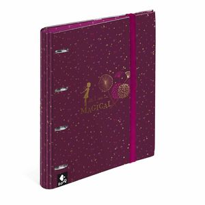 Carpeta anillas recambio MAGICAL está decorada con una impresión en color burdeos y un estampado hecho con las semillas y las plumitas que se dispersan por el aire al soplar la flor del deseo repleta de hadas doradas en contraste y flores en plena dispersión. Destacan en dorado una hada y el lema de Magical. Interiores en rosa.