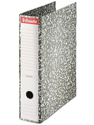 Archivador de palanca forrado de papel jaspeado clásico y mecanismo estándar para uso diario.