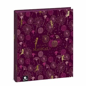 Archivador 4 anillas 3,5 MAGICAL está decorada con una impresión en color burdeos y un estampado hecho con las semillas y las plumitas que se dispersan por el aire al soplar la flor del deseo repleta de hadas doradas en contraste y flores en plena dispersión. Destacan en dorado una hada y el lema de Magical. Interiores en rosa.