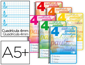 Tapa dura de cartoncillo de 800 g/m² con doble encolado, impresa y plastificada. Papel de 80 g/m². Gran resistencia y rigidez. 80 hojas. Con margen.Estos cuadernos incluyen una cuadrícula pautada en su interior que sirvede guía al alumno en el aprendizaje de la escritura. Espiral nylonizada negra. Coil -lock. 6 colores surtidos.
