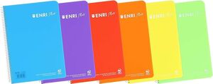 Bloc Enri con espiral. Tapa plástica de colores surtidos, que se sirven aleatoriamente. Tamñano folio, con papel de 90 gramos y hojas 2 rayas 2,5mm.