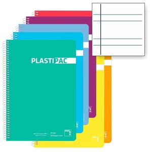 CUBIERTA Extradura de polipropileno traslucido. CONTRACUBIERTA Extradura de polipropileno opaco. PAPEL Blanco EXTRA 90 gr./m2 Rayado en azul. ALAMBRE Espiral nylonizado negro con coil-lock.