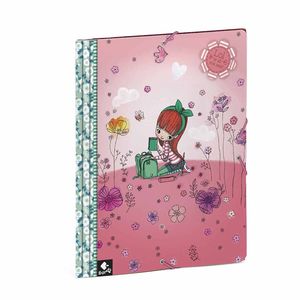 Carpeta gomas LOL está decorada con una impresión estilo Liberty en tonos azul pastel, salvia y turquesa en contraste con los paneles centrales de tonalidades rosa intenso y nuestra dulce chica Lol siempre con su camiseta y sus calcetines de rayas, de protagonista. Interiores rayado verde.