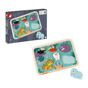 Este puzle de madera permitirá a su hijo descubrir la jungla. Compuesto por 7 piezas grandes con formas de animales, su hijo podrá inventar bonitas historias jugando con las piezas adaptadas al tamaño de sus pequeñas manos. Juguete de madera con certificación FSC y pintura al agua.