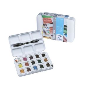 Las acuarelas Van Gogh están clasificadas como gama de pintura de nivel de estudiante y artista. Ofrecen colores brillantes, transparentes e intensos con un gran poder colorante. La mayor parte de los colores están clasificados con el mayor grado de resistencia a la luz, +++ (más de 100 años en iluminación de museo), mientras que unos pocos están clasificados en la categoría siguiente, ++ (entre 25 y 100 años en iluminación de museo). Gracias a su pureza y su viscosidad uniforme, es fácil mezclar estas acuarelas y trabajar con ellas. Producidas con orgullo en Holanda con un estricto control de calidad para lograr una experiencia constante con cada compra. Este set de 12 pastillas de acuarelas viene en un estuche de plástico. Incluye también un pincel redondo de pelo sintético (tamaño 6) y una bandeja para mezclar. Los colores incluidos en esta selección de tipo general son los siguientes: Blanco de China 108, Amarillo limón permanente 254, Amarillo azo medio 269, Rojo permanente claro 370, Laca granza oscuro 331, Azul ultramar oscuro 506, Azul cerúleo ftalo 535, Verde vejiga 623, Verde esmeralda 616, Tierra Siena tostado 411, Ocre amarillo 227, Gris Payne 708. Además, DE REGALO, incluye Rosa quinacridona 366, Azul de Prusia 508, Tierra sombra tostado 409.