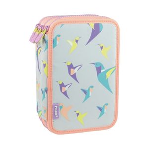 Plumier 3 pisos con contenido. Serie especial Sugar Colibrí Pastel, color rosa y gris. Contenido: 1 goma de borrar 4024, 1 sacapuntas AFILA, 1 lápiz de grafito HB, 3 bolígrafos CAPSULE UNO (azul, negro y verde), 1 regla triangular de 15 cm, 1 tijeras Basic, 5 marcadores fluorescentes, 6 lápices de colores metalizados, 12 lápices de colores triangulares, 18 rotuladores de punta cónica. Composición tejido: exterior y forro interior de poliéster. Medidas: 19,5 x 13 x 7,5 cm.