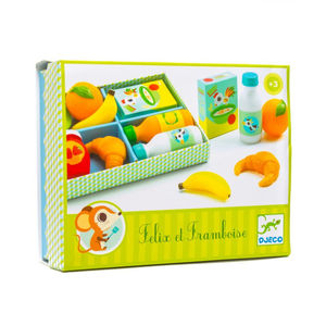 Felix & Framboise es un juego de imitación de Djeco. Contiene leche, zumo, cereales, croissant, mermelada, plátano, naranja y medio kiwi para preparar el desayuno perfecto.