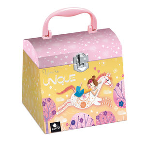 Joyero musical UNIQUE está decorada con estilo ilustrativo, personajes de fantasía en tamaño medio o grande. Colores intensos y detalles en purpurina. El estampado principal de estrellitas blancas sobre fondo rosa vivo convive con las distintas escenas de fantasía, que transcurren sobre un degradado del amarillo al rosa vivo y se aderezan con detalles morados, lilas y turquesas. Algunas pinceladas de brillo transparente resaltan áreas del dibujo y añaden fantasía al conjunto. Interior rosa.