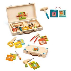 Una caja de herramientas de madera que incluye un martillo, una sierra, un destornillador, un taladro, unos alicates y ocho tarjetas que se hay que ordenar con cuidado y organización. Las cartas asocian una situación con la herramienta adecuada que debe usar Super Bricolo para la reparación. -Un juego de emulación que favorece el aprendizaje.