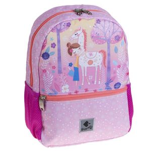 Mochila pequeña infantil UNIQUE está decorada con estilo ilustrativo, personajes de fantasía en tamaño medio o grande. Colores intensos y detalles en purpurina. El estampado principal de estrellitas blancas sobre fondo rosa vivo convive con las distintas escenas de fantasía, que transcurren sobre un degradado del amarillo al rosa vivo y se aderezan con detalles morados, lilas y turquesas. Algunas pinceladas de brillo transparente resaltan áreas del dibujo y añaden fantasía al conjunto. El colgante llavero con forma de estrella acolchado 3D, en color púrpura metalizado, destaca e ilumina todos los formatos textiles de mayor tamaño. El diseño en conjunto destaca por su vivacidad gracias a la combinación del estampado y los degradados de color, al que se suma el luminoso naranja de correas, cuerdas y cremalleras y el fucsia intenso de los laterales de rejilla, de algunos formatos. Colores predominantes: Rosa vivo, degradado de tonos del amarillo al rosa y toques en contraste de naranja, magenta y azules violáceos. Brillo en formatos textiles y acabados de estampación plata, en los formatos de papel.