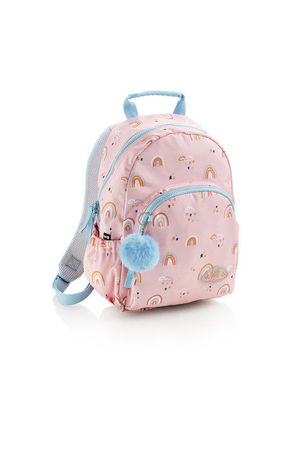 Mochila escolar doble, marca Miquelrius. Capacidad: 15 litros. Tamaño: 350 x 255 x 160 mm. Mochila con doble compartimento con cierre cremallera (uno superior y uno frontal). Cremalleras metálicas de alta calidad, muy resistentes, con tiradores metálicos con cinta para facilitar la apertura. Asas ergonómicas y regulables; espalda y asas acolchadas; ligera y fácil de transportar. Incluye bolsillo organizador con cremallera en el compartimento frontal, bolsillos laterales para botellas y pompón decorativo en el frontal. Material: Composición exterior y forro interior de poliéster.