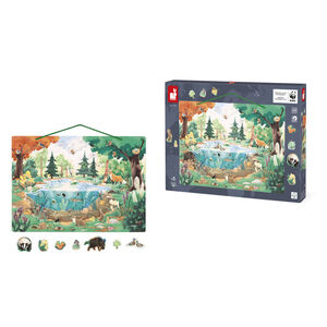 Con esta pizarra magnética con la temática del estanque y el bosque, su hijo podrá divertirse mientras aprende a identificar los diferentes habitantes de la maleza. Esta pizarra está compuesta por 70 imanes de especies animales y vegetales. En el interior, también se incluye un póster educativo de doble cara con los nombres de la flora y la fauna. ¡Práctica! Esta pizarra magnética se puede colocar sobre una mesa o colgar en una habitación gracias a su cordón de tela. Juguete educativo magnético de madera y cartón FSCTM. Para niños a partir de 5 años.