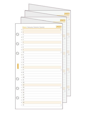 Recambio anual extensible para agendas de anillas Finocam Classic. Visión completa del año desplegado en dos semestres: de enero a junio delante, de julio a diciembre detrás. Ideal para las tareas de la planificación del año. La anualidad contiene los festivos nacionales. Duración: Enero 2023 Diciembre 2023 (12 meses) Interior: Mes Vista Con información de los festivos de España.Idioma del artículo: español. Formato: 609 94x171. Papel.120gr/m2. Papel FSC« ecológico libre de cloro elemental y de ácido, fabricado mediante la utilización de energías limpias, con el 100% de celulosa controlada, y bajo los certificados de calidad ISO9001:2015 y medio ambiente ISO14001:2015, cumpliendo así la normativa ISO9706 sobre la permanencia del papel.