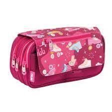 El diseño de este portatodo esta inspirado en los patines de 4 ruedas, sus estampados están creados en tonalidades rosas, mostaza y blanco. Dispone de tres bolsillos con cremallera, un bolsillo en el interior y un pequeño bolsillo frontal en la solapa con cierre de botón a presión.