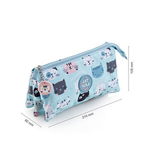 Estuche portatodo triple triangluar, Miquelrius. Tamaño: 115 x 220 x 20 mm. Estuche con tres compartimentos, doble cierre cremallera (una general y otra interior). Capacidad 70 piezas. Cremalleras de plástico de alta calidad, muy resistentes, con tiradores metálicos con pieza de goma para facilitar la apertura. Perfecto para organizar todos los objetos de material escolar. Se añade un llavero de silicona con imagen de un gatito. Material: RPET (poliéster reciclado a partir de botellas de plástico)en el exterior y en el interior poliéster. Respetuoso con el medio ambiente.