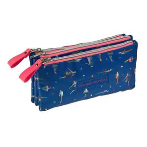 Estuche escolar triple DOLORES PROMESA está decorada con una tela de color azul marino oscuro con estampación de elegantes muñecas vestidas de distintos colores en distintas posiciones que crean un collage muy cool. El logotipo y la imagen de Dolores Promesas bordados en rosa en una etiqueta en el centro. Las cremalleras y las correas son de color rosa, así como los tiradores de cremallera.estuche escolar triple DOLORES PROMESA tiene tres compartimentos con cierre de cremallera para poder distribuir el material de escritura de manera ordenada. Material: poliester impermeabilizado.21,0 x 11,0 x 5,0 cm.