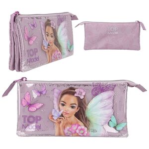 ¡Mágico y fantástico! La cara delantera de este estuche color malva de TOPModel está totalmente adornada con purpurina sobre la que destaca un hada fantástica. Alrededor del hada revolotean delicadas mariposas estampadas. El plus súper mono lo pone la mariposa brillante de metal que cuelga de la cremallera. Bajo la cremallera encontramos tres compartimentos separados para lápices, rotuladores y demás. Material cara delantera: cloruro de polivinilo 100 por 100; interior: poliéster 100 por 100.