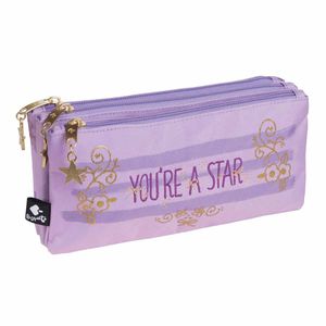Estuche escolar triple STAR esta decorada con una tela de fondo malva con un estampado de rayas y corazones de color malva más intenso y estrellas doradas. En el centro un bordado de hilo dorado de flores con un lazo de tejido de paillettes plata con la frase YOU'RE A STAR en malva. Folros y correas en malva intenso. Tiradores de cremalleras de metal dorado en forma de estrella. Máximo Glamour en cada costura.