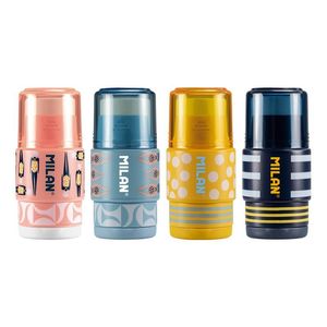 Combinación de goma de borrar y sacapuntas con depósito. Diseño EXTENSION, serie especial Swims. Goma suave de caucho sintético flexible. El sacapuntas dispone de una cuchilla de acero afilada y resistente, ideal para todo tipo de lápices. Sacapuntas con cuchilla de seguridad: este sistema evita que se pueda separar la hoja del cuerpo del sacapuntas. Depósito extensible. Diseño original creado por el departamento de I+D de MILAN. Contiene 5 unidades de color rosa, 5 azul claro, 3 amarillo y 3 azul marino.